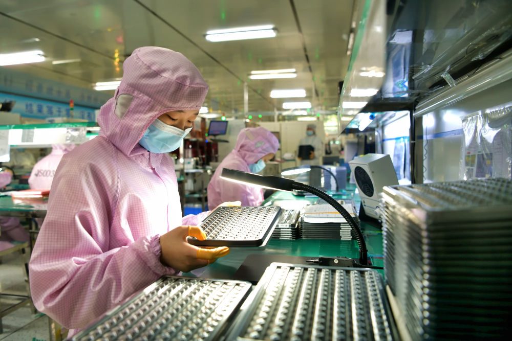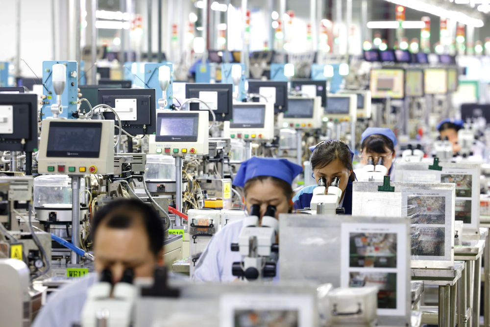 6月24日,正在江苏宿迁泗洪经济开辟区庆邦电子元器件(泗洪)无限公司车间内,工人加紧赶制出口的电子订单产物。发(许昌亮摄)海关总署副署长王令浚说,“上半年,我国石化、纺织等机械设备进口增速都达到了两位数,电子元件等环节零部件较快增加,原油、金属矿砂等主要原材料的进口量添加。”