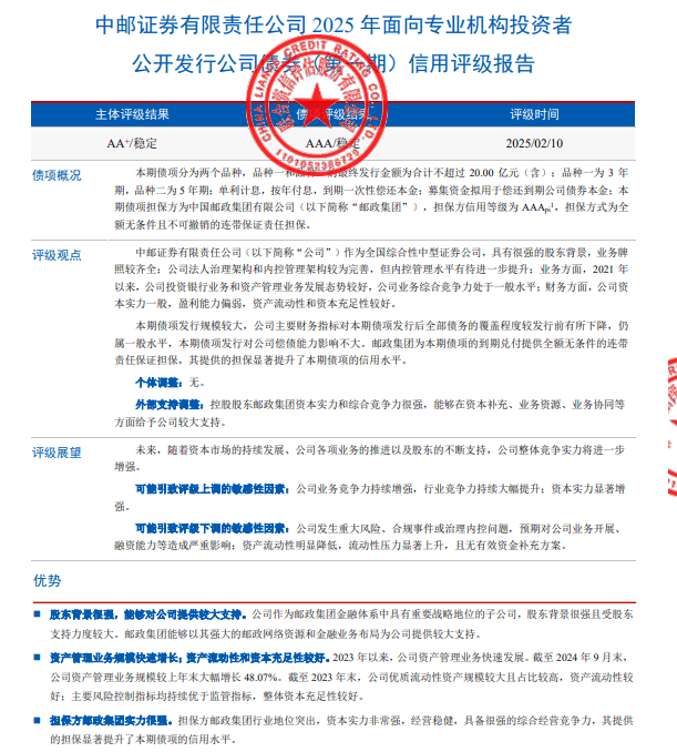 结合资信评估股份无限公司通过对中邮证券无限义务公司及其拟面向专业机构投资者公开辟行的2025年公司债券(第一期)的信用情况进行分析阐发和评估,确定中邮证券从体持久信用品级为 AA+,中邮证券2025年面向专业机构投资者公开辟行公司债券(第一期)信用品级为AAA,评级瞻望为不变。(结合〔2025〕438 号)。